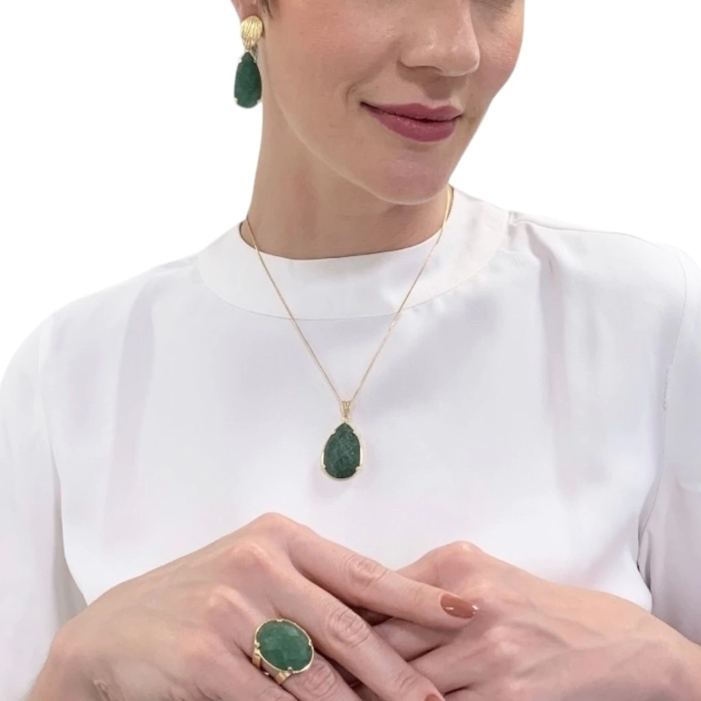 Encante-se com o Anel Lumina, uma peça de elegância incomparável que combina a beleza rica do quartzo verde multifacetado com o requinte do metal ajustável banhado a ouro 18k. Cada faceta do quartzo verde captura e reflete a luz de maneira deslumbrante, criando um brilho sofisticado que realça sua beleza natural. O aro ajustável proporciona um encaixe perfeito e confortável, enquanto o banho de ouro 18k adiciona um toque de luxo e durabilidade. O Anel Lumina é a escolha ideal para quem deseja um acessório que une elegância clássica e a energia revitalizante do quartzo verde. Eleve seu estilo e sinta a conexão com a natureza com esta peça única e atemporal.